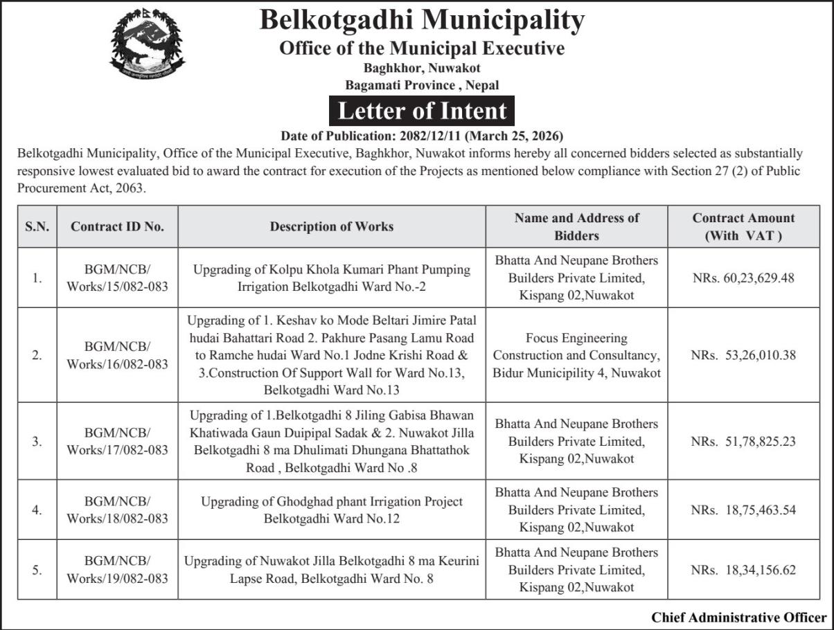 बोलपत्र स्वीकृत गर्ने आशयको सूचना !