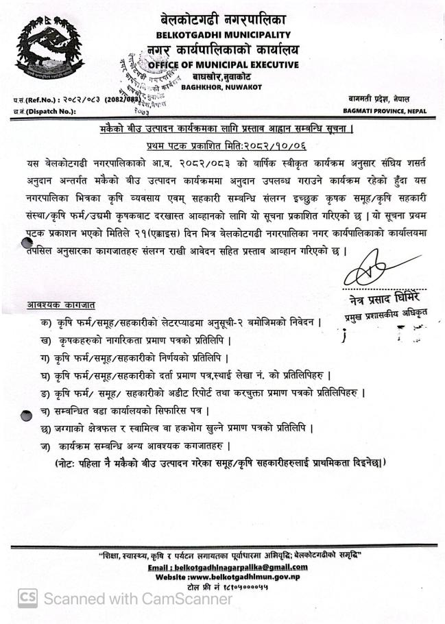 मकैको विउ उत्पादन कार्यक्रमको लागि प्रस्ताव आव्हान सम्बन्धी सूचना !