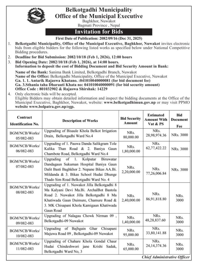 विभिन्न सडक तथा सिंचाई योजना स्तरोन्नतिको लागि बोलपत्र आव्हान सम्बन्धी सूचना ।