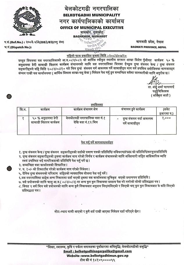 ५० % अनदानमा डेरी समाग्री वितरण कार्यक्रम सम्बन्धि सूचना !