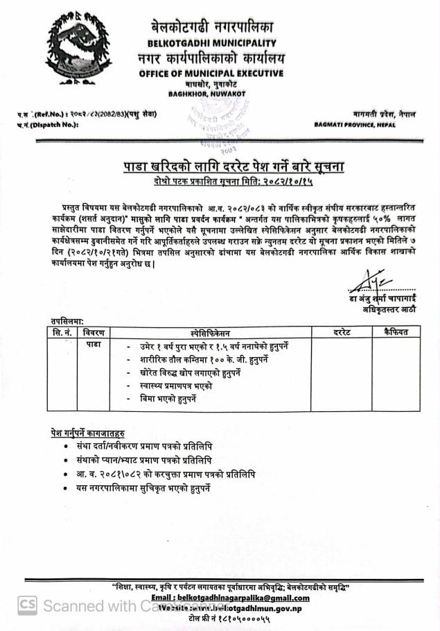 पाडा खरिदको लागि दररेट पेश गर्ने बारे सूचना !
