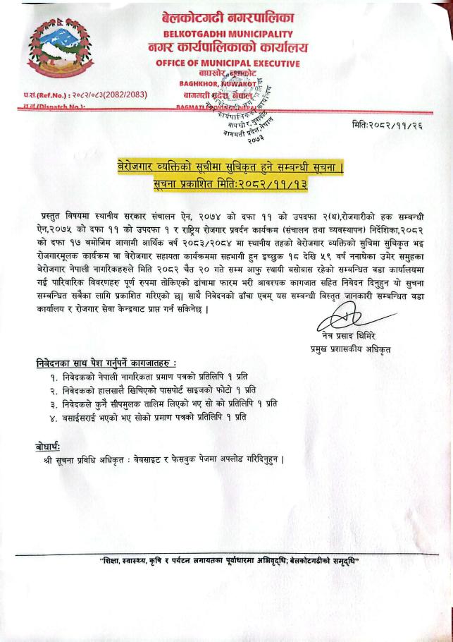 बेरोजगार व्यक्तिको सूचीमा सूचीकृत हुने सम्बन्धी सूचना !