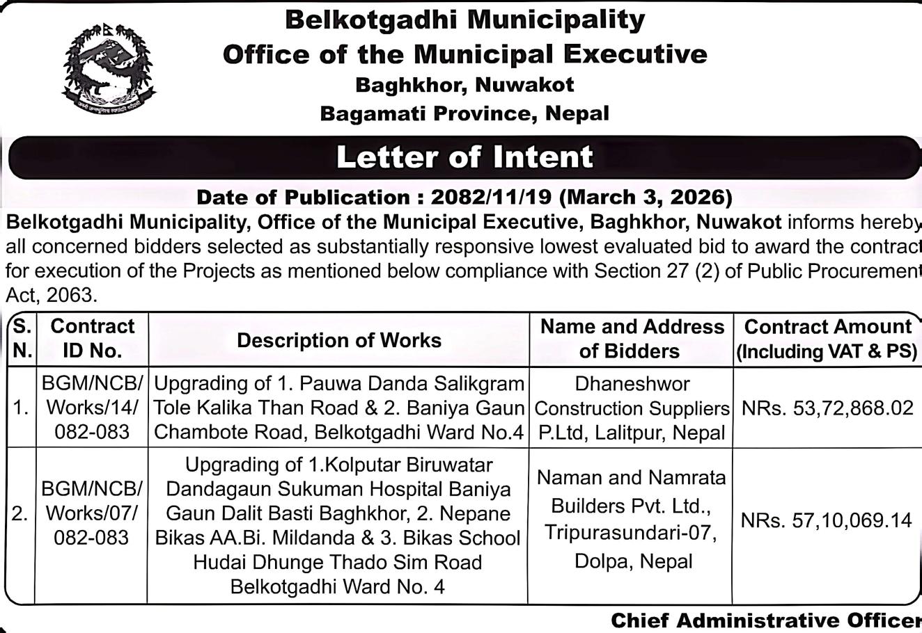 बोलपत्र स्वीकृत गर्ने आशयको सूचना !