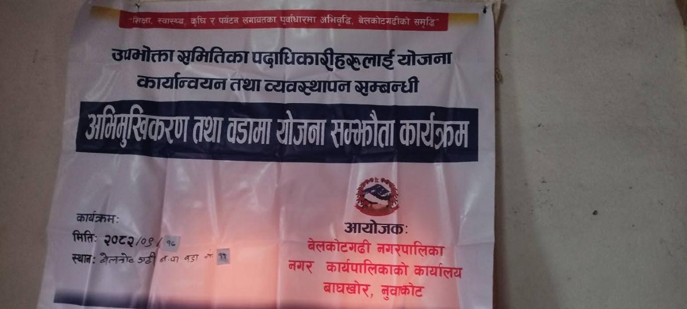 वडा नं. ११ स्थित वडा कार्यालयमा नगर उप प्रमुख, जनप्रतिनिधि, कर्मचारी, उपभोक्ता समितिका पदाधिकारी लगायत सरोकारवालाहरुको उपस्थितिमा उपभोक्ता समितिका पदाधिकारीहरुलाई योजना कार्यक्रम तथा व्यवस्थापन सम्बन्धी अभिमुखिकरण र वडामा योजना सम्झौता कार्यक्रम !