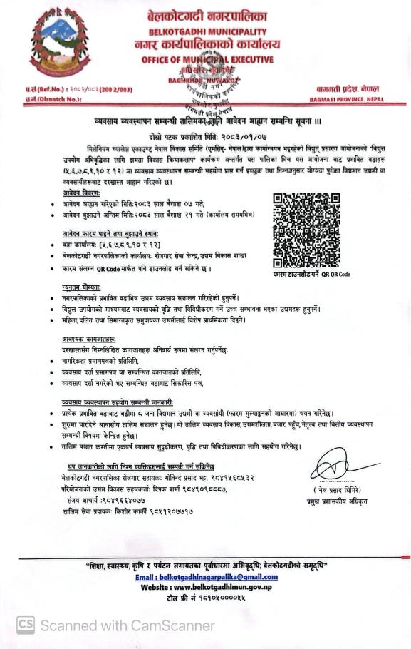 व्यवसाय व्यवस्थापन तालिमको लागि आवेदन आव्हान सम्बन्धी सूचना !