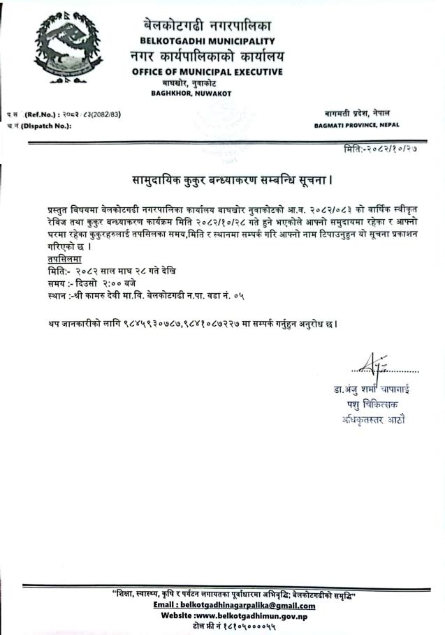 सामुदायिक कुकुर वन्ध्याकरण सम्बन्धी सूचना !