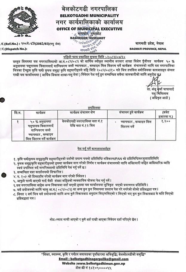५० % अनुदानमा पशुपालक किसानलाई यान्त्रिकरण जस्तै च्यापकटर, कम्बाइन मिल वितरण गर्ने कार्यक्रम सम्बन्धि सूचना !